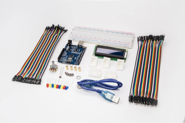 • Плата Atmega Uno • Макетная плата • Соединительные провода • Набор светодиодов • Потенциометр • Фоторезисторы • LCD-дисплей 16х2 I2C • USB-кабель • Набор крепежа • Детали корпуса