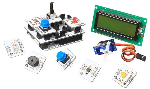 Atmega — контроллер из семейства Arduino, датчики, светодиоды, кнопки, сервопривод и LCD-дисплей. Готовые модули соединяются между собой без пайки и хлопот.